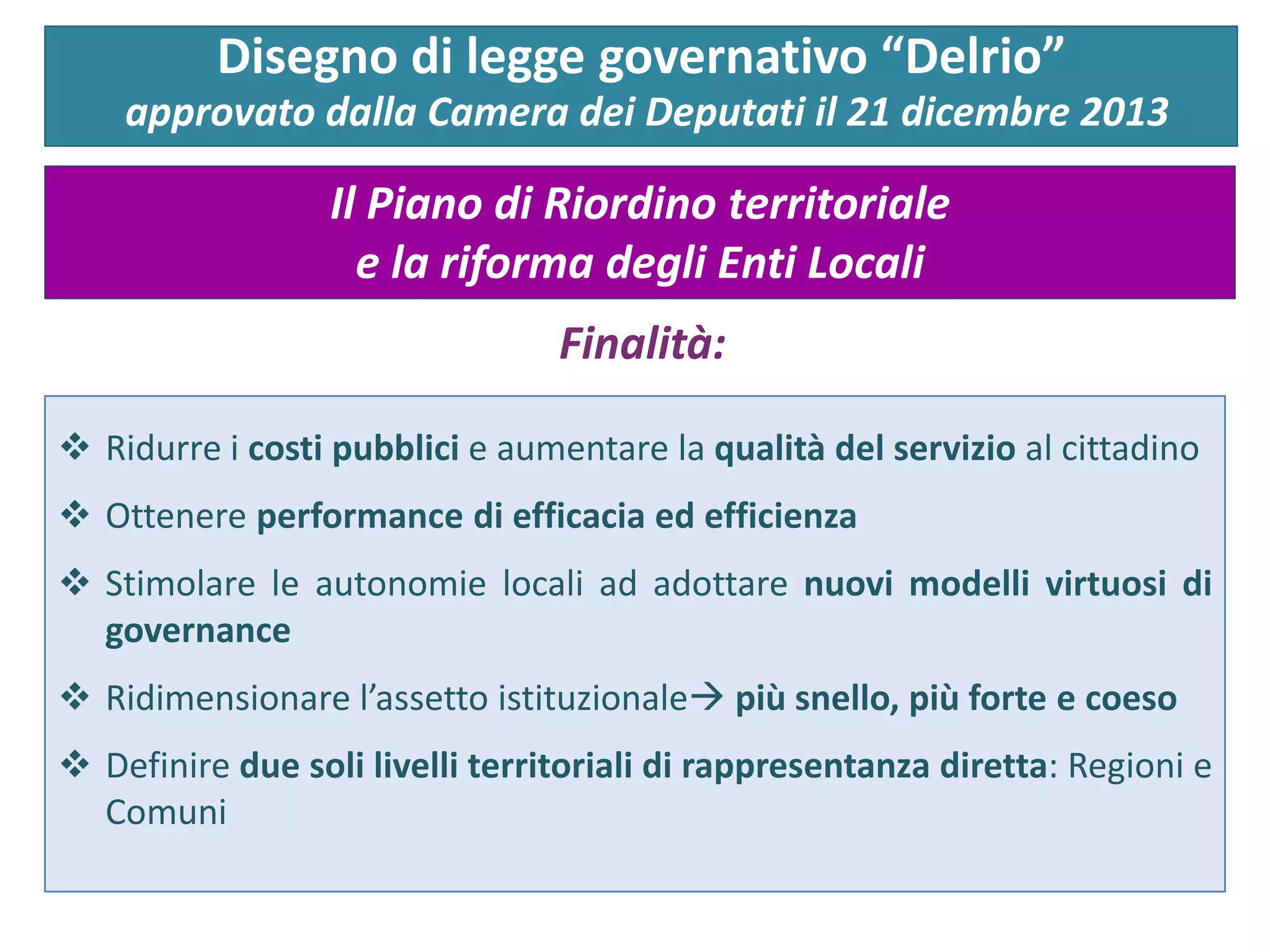 Il documento analizza il disegno di legge governativo 'Delrio', approvato il 21 dicembre 2013, che mira a riorganizzare il territorio italiano attraverso l'istituzione di città metropolitane, nuove province e unioni di comuni, con l'obiettivo di razionalizzare la spesa pubblica e migliorare i servizi al cittadino. Viene sottolineato il ruolo centrale dei sindaci nella pianificazione strategica e nella gestione delle funzioni locali, con un riposizionamento delle autonomie locali per promuovere modelli di governance più efficaci. Il disegno di legge prevede una riduzione dei livelli di rappresentanza e conferisce responsabilità più forti agli enti locali di secondo livello.
