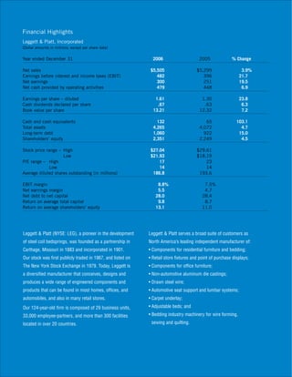 Leggett & Platt's 2006 annual report outlines its goals for the future. It aims to achieve annual sales growth of 8-10% through 3-5% internal growth and 5% from acquisitions. It also targets an 11% EBIT margin by 2009, up from around 8.5%, by introducing new products, increasing sales, entering new markets, and improving efficiency. To reach these goals, Leggett & Platt will reinvigorate product development, establish a council of senior researchers, and develop new market opportunities through ideas generation and acquisitions to devote more cash flow to growth.