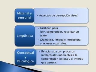 El documento describe tres aspectos clave de la comprensión lectora: material y sensorial (aspectos visuales y facilidad para leer), lingüística (gramática y estructura del lenguaje), y conceptual y psicológica (procesos intelectuales y el interés que genera). También recomienda usar párrafos y oraciones cortas, palabras concretas, un formato atractivo, y establecer relaciones entre lo leído para facilitar la comprensión.