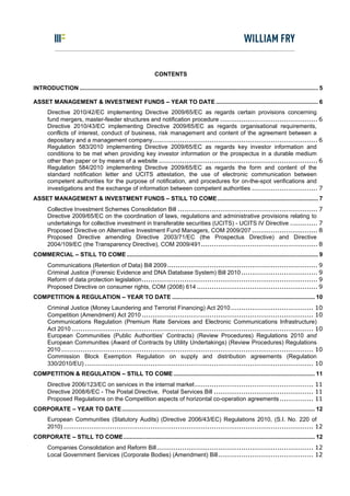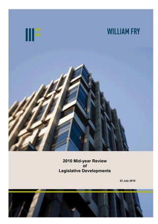 This document provides a mid-year review of legislative developments in Ireland relating to various areas including asset management, commercial law, competition and regulation, corporate law, employment and benefits, energy and natural resources, and taxation. It summarizes laws passed in the first half of 2010 and upcoming legislation still to be enacted. The review is organized by topic area and lists relevant European Union directives, regulations, and proposals as well as Irish bills and acts.