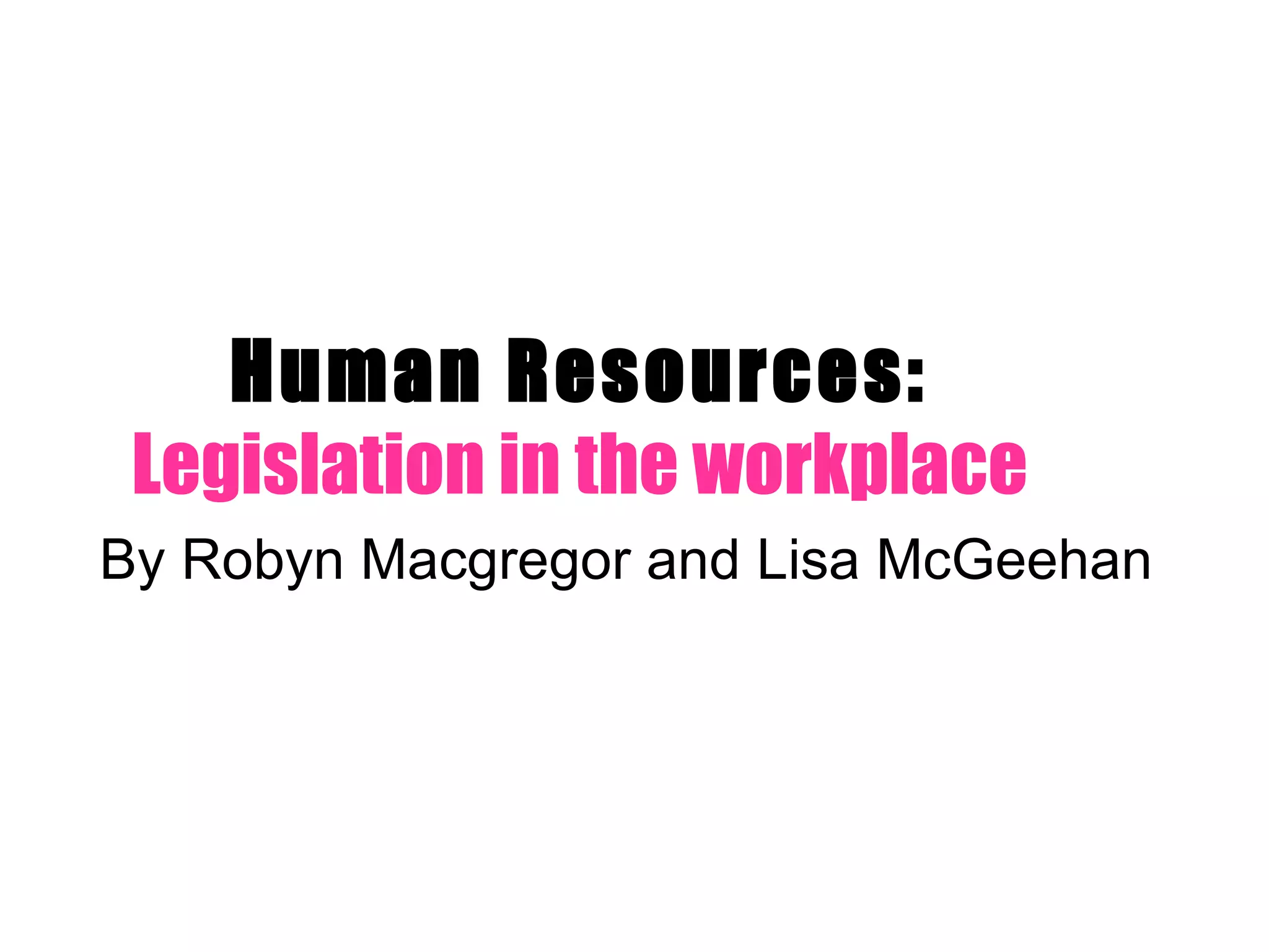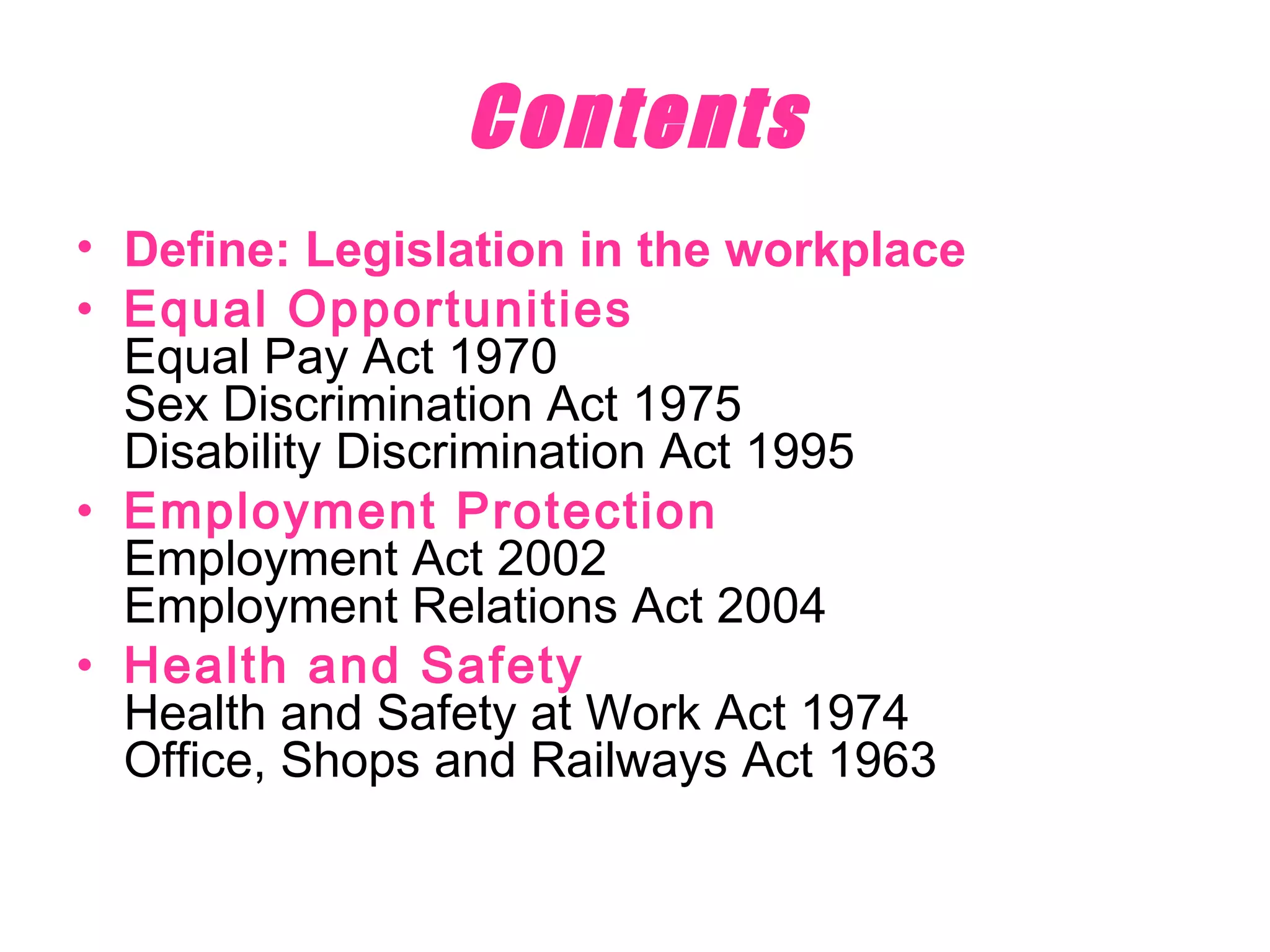 The document defines and describes various UK legislation related to human resources and employment, including those covering equal opportunities, health and safety, employment protection, and disability rights. It discusses acts such as the Equal Pay Act of 1970, Sex Discrimination Act of 1975, Disability Discrimination Act of 1995, Employment Act of 2002, and Health and Safety at Work Act of 1974. The legislation establishes requirements for equal pay, non-discrimination, flexible working arrangements, occupational health and safety standards, and other employee protections and rights.