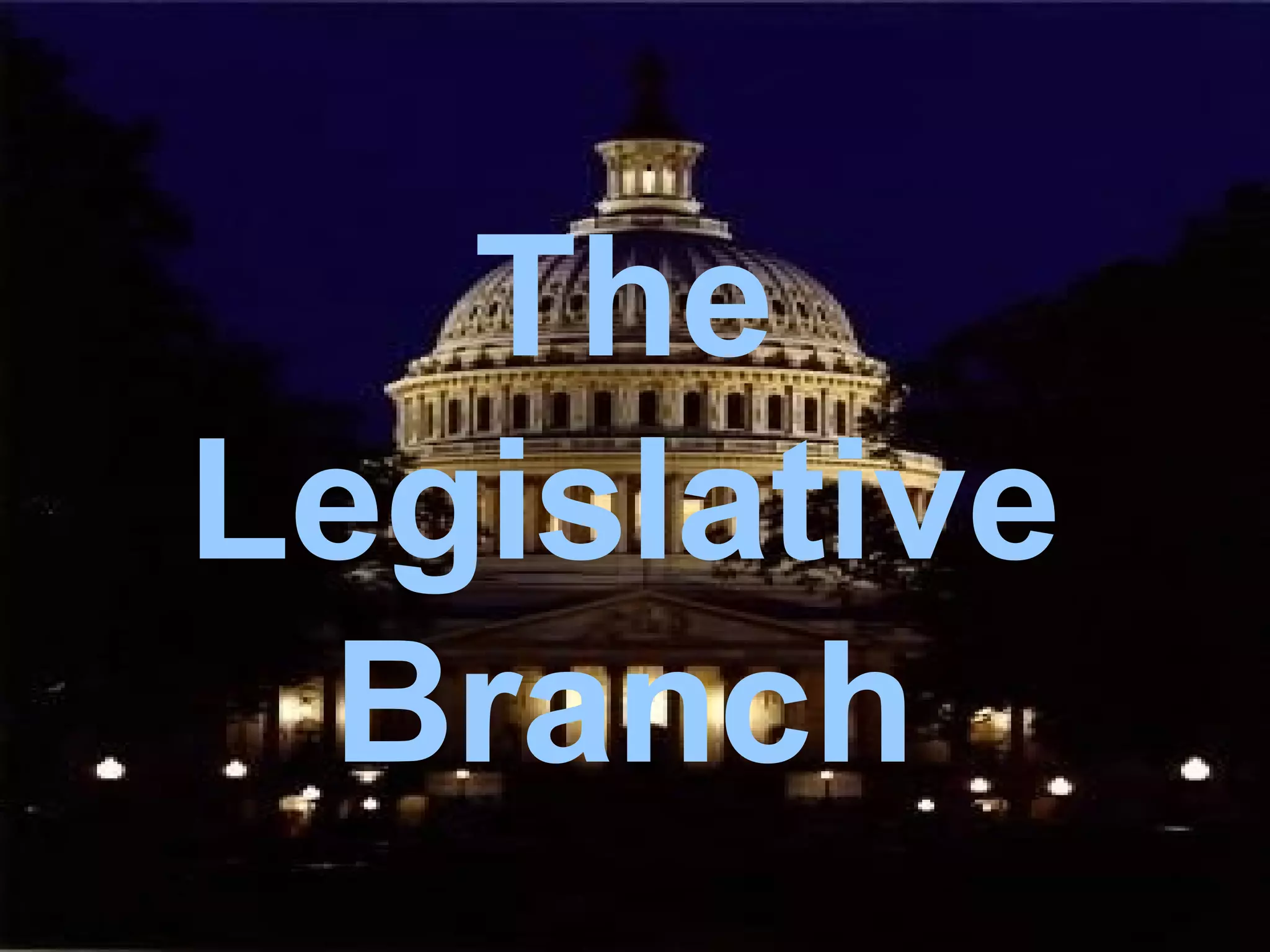 The document summarizes the structure and powers of the United States Congress. It describes Congress as a bicameral legislative body consisting of the House of Representatives and the Senate. It outlines the qualifications, terms, and election processes for both chambers. It also discusses the powers of Congress, including expressed powers directly granted by the Constitution as well as implied powers.