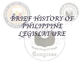 The document provides an overview of the evolution of the Philippine legislative system from Spanish colonial rule to the present-day Congress. It discusses how representation in the Spanish Cortes evolved over time. It then outlines the legislative bodies that followed, including the Malolos Congress (1898-1899), the Philippine Commission (1901), the establishment of an elective legislature through the Jones Act (1916), the National Assembly under the 1935 Constitution, and the restoration of the bicameral Congress in 1941. It further describes the establishment of the unicameral Batasang Pambansa under martial law in 1972, its abolition following the 1986 People Power Revolution, and the reestablishment of the current bicameral Congress under the 1987