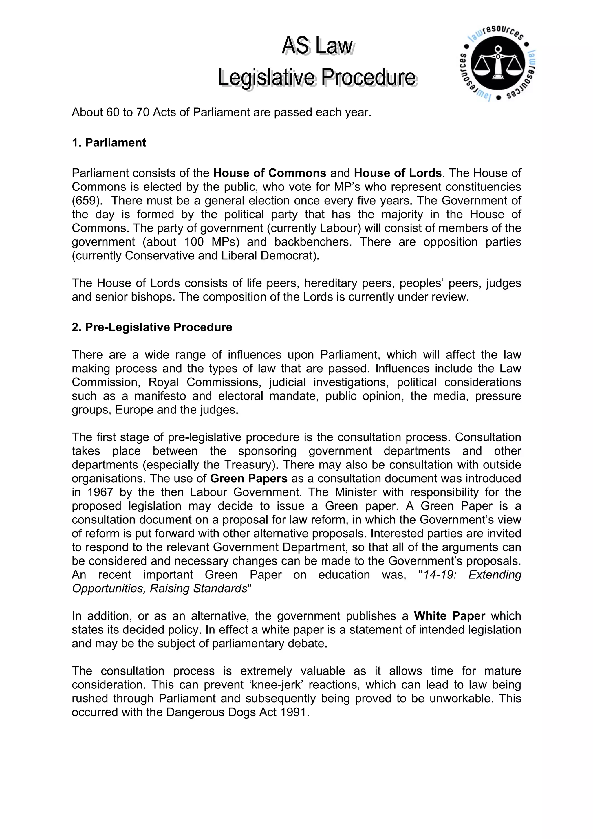 Parliament consists of the House of Commons and House of Lords. Bills are introduced and debated in both houses before receiving royal assent to become acts. There are several stages of legislative procedure including introduction, committee review, amendments, and debate. Criticisms of the law making process include complex language, over-elaborate acts, and a lack of scrutiny due to time constraints. Parliamentary sovereignty means acts passed by Parliament supersede all other laws, however this has been limited by EU membership and human rights laws.