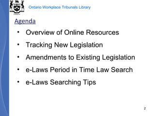 This document provides an overview of resources and methods for conducting legislative research in Ontario, highlighting various online databases for tracking new legislation, amendments, and government documents. Key resources include e-laws, Ontario Gazette, Canada Gazette, and legislative assembly websites, which offer access to bills, debates, and government reports. It includes guidance on searching for historical legislation and using specific search techniques to find relevant information.