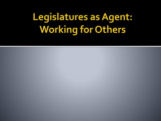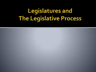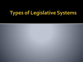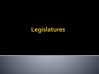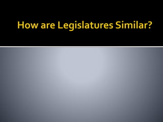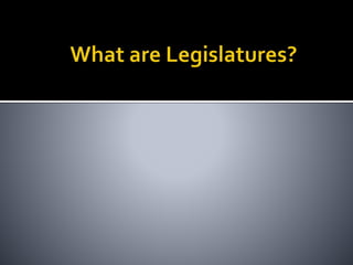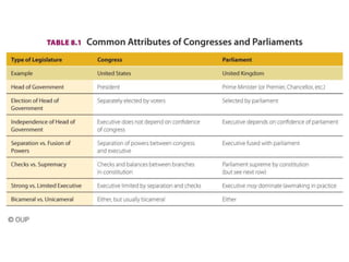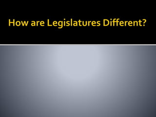 This document provides an overview of legislatures and legislative systems. It discusses the key characteristics of parliamentary and presidential systems, including the relationship between the executive and legislative branches. It also outlines some of the variations that exist among legislative bodies in terms of structure, functions, and powers. Some of the topics covered include bicameralism, legislative oversight, budget approval, and powers like filibusters. Electoral systems like plurality voting and proportional representation are also summarized.