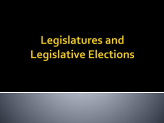 This document provides an overview of legislatures and legislative systems. It discusses the key features of parliamentary and presidential systems, including that parliamentary systems have an executive selected from the legislature who can be removed by a legislative vote of no confidence, while presidential systems have a separation of powers between the independent executive and legislature. It also covers types of electoral systems, representation, legislative functions like lawmaking and oversight, and comparisons between unicameral and bicameral legislatures.