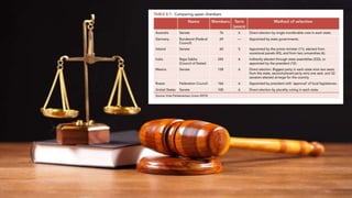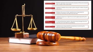 Legislatures are institutions of government that are directly elected to represent local districts and citizens. A legislature has several key functions: representing citizens, deliberating on public matters, legislating or passing bills into law, authorizing government expenditures, forming governments, and overseeing the executive. Legislatures have either one or two chambers and operate through committees where most lawmaking is done. Effective legislatures have appropriate powers, committed members, and resources to represent citizens, pass effective laws, and provide oversight of the government.