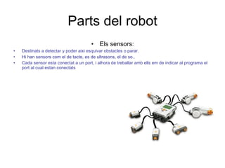 Parts del robotEls sensors : Destinats a detectar y poder aixi esquivar obstacles o parar. Hi han sensors com el de tacte, es de ultrasons, el de so.. Cada sensor esta conectat a un port, i alhora de treballar amb ells em de indicar al programa el port al cual estan conectats