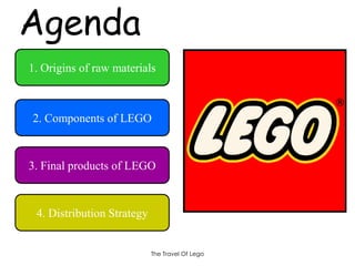 The document summarizes the supply chain of Lego products from sourcing raw materials like plastic and rubber, to manufacturing components through molding and painting/decorating, packaging, distribution through a single warehouse in partnership with DHL, and finally reaching end consumers through specialty retail stores, online ordering, and other retailers. It also discusses Lego's rationale for centralizing its supply chain after continual profit losses in the late 1990s/early 2000s, and some difficulties in implementing the new centralized strategy including strained relationships and lower than expected delivery frequencies.