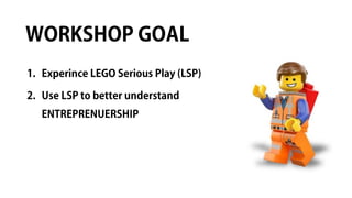 This document outlines an agenda for a facilitated thinking session using LEGO Serious Play (LSP). The session will use LEGO models and metaphorical storytelling to explore the topic of entrepreneurship. It will involve periods of individual and group model building, story sharing, questioning, and reflection. LSP is designed to get 100% participation through hands-on model building and to draw on 80% of participants' brains. Guidelines emphasize respect, listening, and questioning models rather than people. The goal is constructive inclusive discussion and new perspectives on entrepreneurship.
