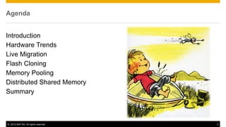 This document discusses a research project called Hecatonchire that aims to provide distributed shared memory (DSM) capabilities to cloud computing. Hecatonchire breaks down physical servers into their core components of CPU, memory, and I/O, and extends existing cloud software like KVM, QEMU, and libvirt to allow virtual machines to transparently access remote resources. Some key capabilities discussed include live migration, flash cloning for rapid auto-scaling, memory pooling to access unused memory on remote hosts, and the long term goal of implementing true DSM across the cluster. The presentation was given by researchers from SAP Research in Belfast and Israel.