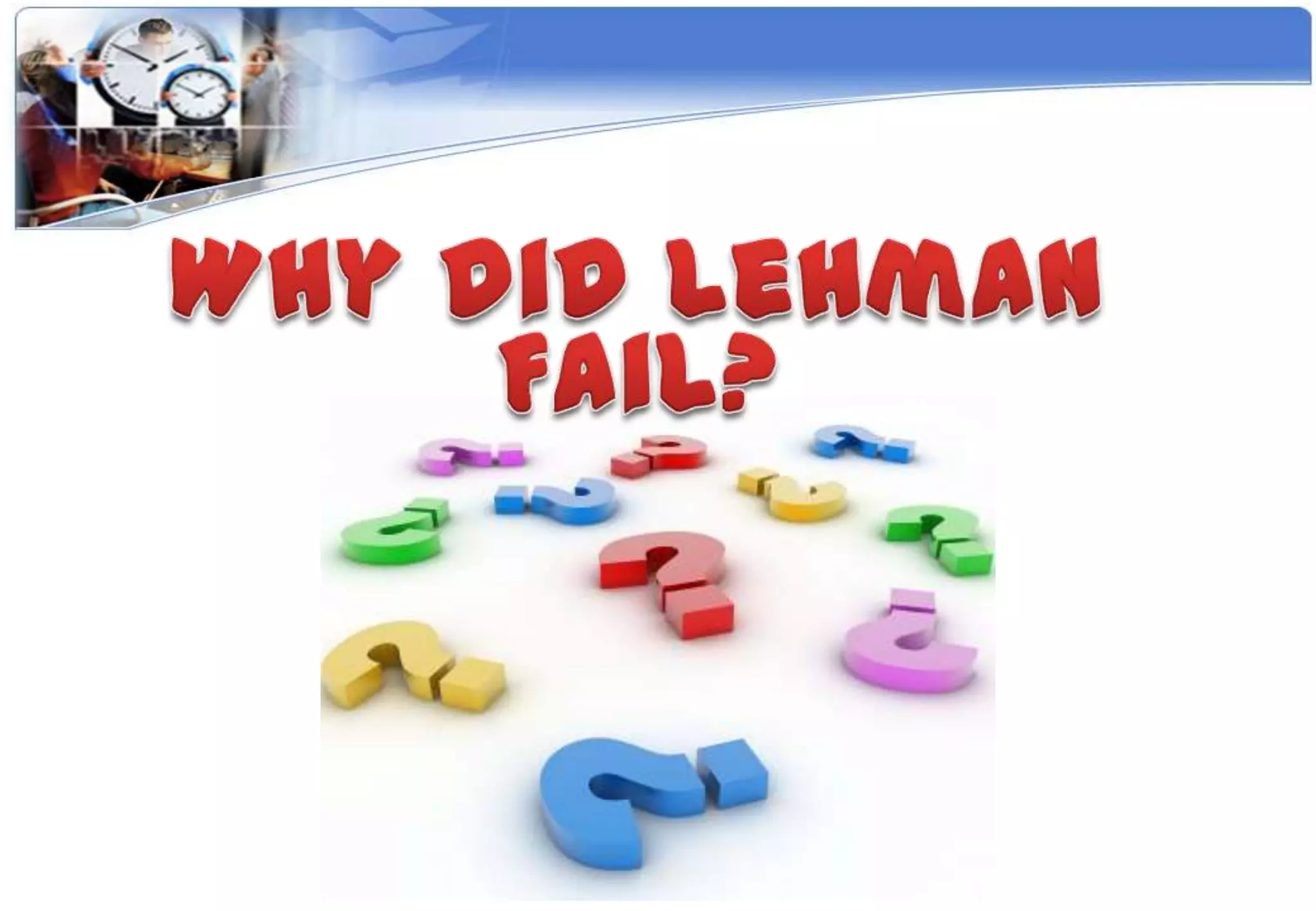Lehman Brothers filed for bankruptcy in September 2008 with $639 billion in assets and $619 billion in debt, marking the largest bankruptcy filing in U.S. history. The document analyzes the causes of Lehman Brothers' failure, including corporate governance failures such as weak risk management, issues with the board of directors, problematic compensation schemes, and flawed nomination committees. Technical failures and other market factors also contributed to Lehman Brothers' collapse.