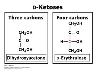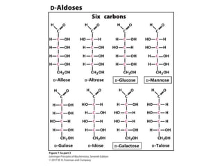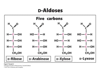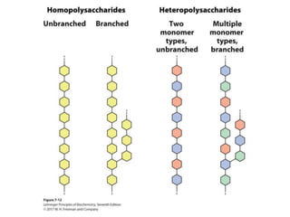 Carbohydrates are the most abundant biological molecules and serve important functions like energy storage and providing structural materials. They range in size from small molecules to very large polymers. The document discusses the structures, properties and functions of important carbohydrates like monosaccharides, disaccharides, and polysaccharides. Key polysaccharides include starch, glycogen, cellulose, chitin and glycosaminoglycans which serve structural or energy storage roles in plants and animals.