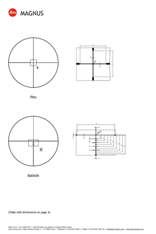 The document provides specifications for various magnus reticle types from Leica Camera AG as of April 2013, including dimensions and measurements in centimeters at 100 meters. It lists essential details such as distance between posts, cross-hair sub-tension, dot coverage, and stadia line width for different reticle models. The content emphasizes that specifications are subject to change without notice.