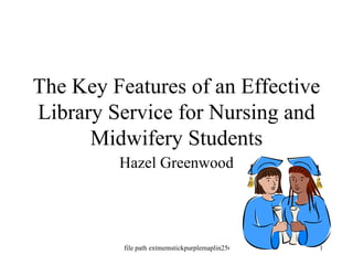 The document discusses key features of an effective library service for nursing and midwifery students. It recommends that the library provide accessible facilities for all users, including distance learners, with clear signposting and 24 hour access. The librarian should be highly aware of students' requirements and provide guidance on resources like research guides, databases, and special equipment loans. An initial library tour and tailored tutorials can help students learn to use available materials most effectively.