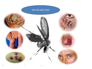 Leishmania is a genus of protozoan parasites that causes leishmaniasis, a vector-borne disease spread by sandfly bites. It exists in two forms: amastigotes within host cells and promastigotes in sandflies. The disease manifests as visceral, cutaneous, or mucocutaneous leishmaniasis depending on the infected tissues. Visceral leishmaniasis affects internal organs while cutaneous primarily affects the skin. Diagnosis involves detecting the parasites microscopically or through culture. Treatment involves pentavalent antimonials, amphotericin B, or miltefosine. Control relies on reducing sandfly and reservoir populations through insecticides and treating