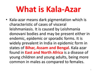 Leishmaniasis is caused by protozoan parasites of the genus Leishmania and is transmitted by sand flies. Kala-azar, also known as visceral leishmaniasis, is caused by L. donovani and presents with fever, weight loss, enlarged liver and spleen. It is diagnosed by identifying the parasites in bone marrow or spleen aspirates under microscopy. Treatment involves pentavalent antimony compounds. Control relies on vector control measures and treating infected individuals to reduce the reservoir and prevent epidemics. Some patients may later develop a skin condition called post-kala azar dermal leishmaniasis.