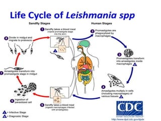 This document describes Leishmania donovani, the parasite that causes visceral leishmaniasis or kala-azar. It discusses the parasite's classification, life cycle within human and sand fly hosts, geographic distribution, morphology in amastigote and promastigote forms, transmission via phlebotomine sand fly bites, pathology in organs like the spleen and liver, clinical features of kala-azar infection, and treatments like liposomal amphotericin B and miltefosine. It also briefly summarizes Leishmania species complexes that cause cutaneous and mucocutaneous leishmaniasis.