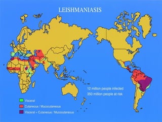 2. Leishmaniasis is transmitted by the bite of infected sandflies and presents as cutaneous, mucocutaneous, or visceral disease. Visceral leishmaniasis, known as kala-azar, is the most serious form.