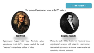 The document summarizes the principles and components of a UV-Visible spectrophotometer. It discusses how Isaac Newton and Joseph von Fraunhofer made early contributions to spectroscopy. The key components of a UV-Vis spectrophotometer include a light source, monochromator, sample holder, detector, and signal processor. The monochromator separates light into wavelengths and the detector measures light intensity. UV-Vis spectroscopy provides information on functional groups and chemical structure by measuring absorption of light across wavelengths.