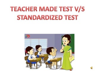 Teacher-made tests are intended to measure the specific learning outcomes of a particular teacher's students and are not scientifically prepared, while standardized tests aim to measure general educational outcomes across multiple schools. Standardized tests involve preparing a design, pilot testing items, analyzing items to discard unsuitable ones, final testing a sample population, establishing scoring procedures and norms, and determining validity and reliability, while providing guidance for teachers but potentially making inaccurate judgments of students.