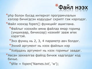 *Файл нээхэд fopen() функцийг ашиглана.