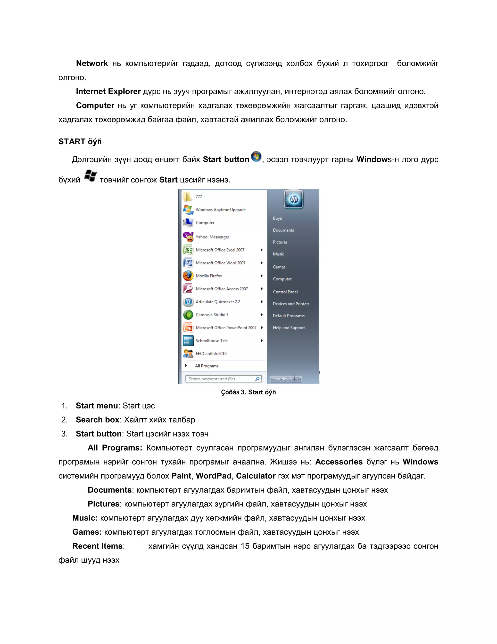гадаад, дотоод сүлжээнд холбох бүхий л тохиргоог боломжийг олгоно. Internet Explorer дүрс нь зууч програмыг ажиллуулан, интернэтэд аялах боломжийг олгоно. Computer нь уг компьютерийн хадгалах төхөөрөмжийн жагсаалтыг гаргаж, цаашид идэвхтэй хадгалах төхөөрөмжид байгаа файл, хавтастай ажиллах боломжийг олгоно. START öýñ Дэлгэцийн зүүн доод өнцөгт байх Start button , эсвэл товчлуурт гарны Windows-н лого дүрс бүхий товчийг сонгож Start цэсийг нээнэ. Çóðàã 3. Start öýñ 1. Start menu: Start цэс 2. Search box: Хайлт хийх талбар 3. Start button: Start цэсийг нээх товч All Programs: Компьютерт суулгасан програмуудыг ангилан бүлэглэсэн жагсаалт бөгөөд програмын нэрийг сонгон тухайн програмыг ачаална. Жишээ нь: Accessories бүлэг нь Windows системийн програмууд болох Paint, WordPad, Calculator гэх мэт програмуудыг агуулсан байдаг. Documents: компьютерт агуулагдах баримтын файл, хавтасуудын цонхыг нээх Pictures: компьютерт агуулагдах зургийн файл, хавтасуудын цонхыг нээх Music: компьютерт агуулагдах дуу хөгжмийн файл, хавтасуудын цонхыг нээх Games: компьютерт агуулагдах тоглоомын файл, хавтасуудын цонхыг нээх Recent Items: хамгийн сүүлд хандсан 15 баримтын нэрс агуулагдах ба тэдгээрээс сонгон файл шууд нээх