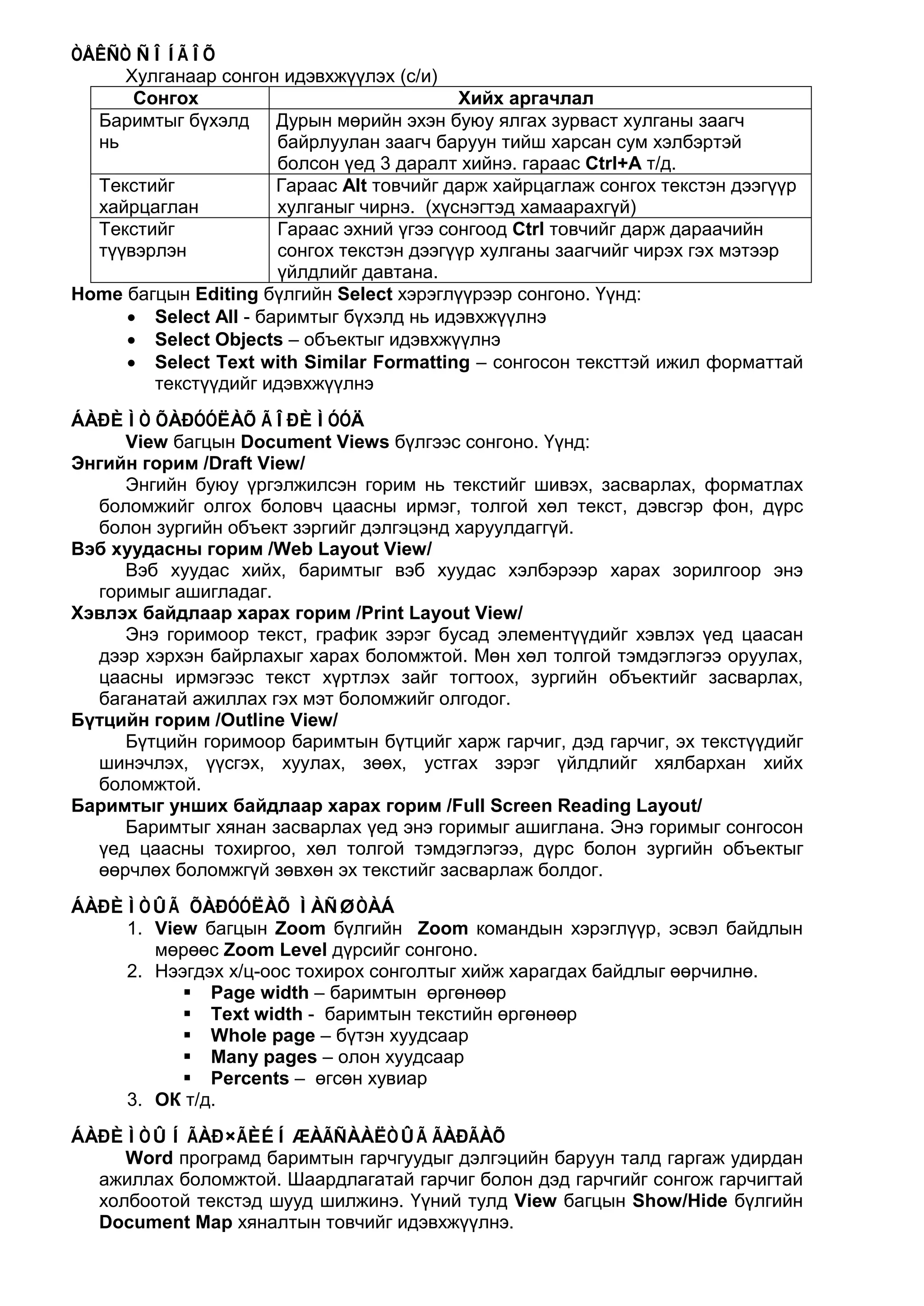 Хулганаар сонгон идэвхжүүлэх (с/и) Сонгох Хийх аргачлал Баримтыг бүхэлд Дурын мөрийн эхэн буюу ялгах зурваст хулганы заагч нь байрлуулан заагч баруун тийш харсан сум хэлбэртэй болсон үед 3 даралт хийнэ. гараас Ctrl+A т/д. Текстийг Гараас Alt товчийг дарж хайрцаглаж сонгох текстэн дээгүүр хайрцаглан хулганыг чирнэ. (хүснэгтэд хамаарахгүй) Текстийг Гараас эхний үгээ сонгоод Ctrl товчийг дарж дараачийн түүвэрлэн сонгох текстэн дээгүүр хулганы заагчийг чирэх гэх мэтээр үйлдлийг давтана. Home багцын Editing бүлгийн Select хэрэглүүрээр сонгоно. Үүнд: • Select All - баримтыг бүхэлд нь идэвхжүүлнэ • Select Objects – объектыг идэвхжүүлнэ • Select Text with Similar Formatting – сонгосон тексттэй ижил форматтай текстүүдийг идэвхжүүлнэ ÁÀÐÈÌÒ ÕÀÐÓÓËÀÕ ÃÎÐÈÌÓÓÄ View багцын Document Views бүлгээс сонгоно. Үүнд: Энгийн горим /Draft View/ Энгийн буюу үргэлжилсэн горим нь текстийг шивэх, засварлах, форматлах боломжийг олгох боловч цаасны ирмэг, толгой хөл текст, дэвсгэр фон, дүрс болон зургийн объект зэргийг дэлгэцэнд харуулдаггүй. Вэб хуудасны горим /Web Layout View/ Вэб хуудас хийх, баримтыг вэб хуудас хэлбэрээр харах зорилгоор энэ горимыг ашигладаг. Хэвлэх байдлаар харах горим /Print Layout View/ Энэ горимоор текст, график зэрэг бусад элементүүдийг хэвлэх үед цаасан дээр хэрхэн байрлахыг харах боломжтой. Мөн хөл толгой тэмдэглэгээ оруулах, цаасны ирмэгээс текст хүртлэх зайг тогтоох, зургийн объектийг засварлах, баганатай ажиллах гэх мэт боломжийг олгодог. Бүтцийн горим /Outline View/ Бүтцийн горимоор баримтын бүтцийг харж гарчиг, дэд гарчиг, эх текстүүдийг шинэчлэх, үүсгэх, хуулах, зөөх, устгах зэрэг үйлдлийг хялбархан хийх боломжтой. Баримтыг унших байдлаар харах горим /Full Screen Reading Layout/ Баримтыг хянан засварлах үед энэ горимыг ашиглана. Энэ горимыг сонгосон үед цаасны тохиргоо, хөл толгой тэмдэглэгээ, дүрс болон зургийн объектыг өөрчлөх боломжгүй зөвхөн эх текстийг засварлаж болдог. ÁÀÐÈÌÒÛà ÕÀÐÓÓËÀÕ ÌÀÑØÒÀÁ 1. View багцын Zoom бүлгийн Zoom командын хэрэглүүр, эсвэл байдлын мөрөөс Zoom Level дүрсийг сонгоно. 2. Нээгдэх х/ц-оос тохирох сонголтыг хийж харагдах байдлыг өөрчилнө. Page width – баримтын өргөнөөр Text width - баримтын текстийн өргөнөөр Whole page – бүтэн хуудсаар Many pages – олон хуудсаар Percents – өгсөн хувиар 3. OК т/д. ÁÀÐÈÌÒÛÍ ÃÀÐ×ÃÈÉÍ ÆÀÃÑÀÀËÒÛà ÃÀÐÃÀÕ Word програмд баримтын гарчгуудыг дэлгэцийн баруун талд гаргаж удирдан ажиллах боломжтой. Шаардлагатай гарчиг болон дэд гарчгийг сонгож гарчигтай холбоотой текстэд шууд шилжинэ. Үүний тулд View багцын Show/Hide бүлгийн Document Map хяналтын товчийг идэвхжүүлнэ.