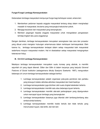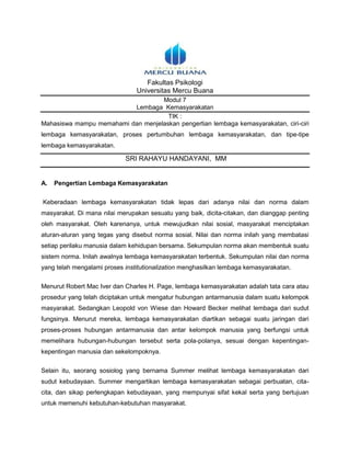 Dokumen ini membahas tentang lembaga kemasyarakatan, definisi, ciri-ciri, fungsi, proses pertumbuhan, dan tipe-tipe lembaga tersebut. Lembaga kemasyarakatan terdiri dari norma dan nilai yang membantu mengatur perilaku serta hubungan antarwarga masyarakat. Pembentukan lembaga ini terjadi melalui proses institusionalisasi dan dapat dibedakan menjadi berbagai tipe berdasarkan perkembangan, sistem nilai, penerimaan masyarakat, penyebaran, dan fungsi lembaga.