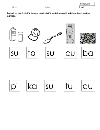 Dokumen ini berisi aktivitas untuk mengajar suku kata kepada pelajar, termasuk menghiaskan suku kata, memadankan suku kata dengan gambar, dan menggabungkan huruf konsonan dan vokal. Terdapat dua kumpulan yang memiliki tugas yang berbeda. Setiap tugas mencakup pengisian nama, kelas, dan tarikh dari pelajar.