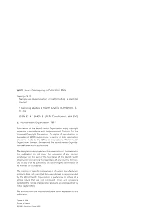 This document provides an introduction and tables for determining sample sizes in various health studies. It covers one-sample situations like estimating a population proportion with absolute or relative precision and hypothesis tests for a population proportion. Two-sample situations covered include estimating the difference between two population proportions and hypothesis tests for two population proportions. It also addresses case-control studies, cohort studies, lot quality assurance sampling, and incidence-rate studies. Tables of minimum sample sizes are provided for each situation.