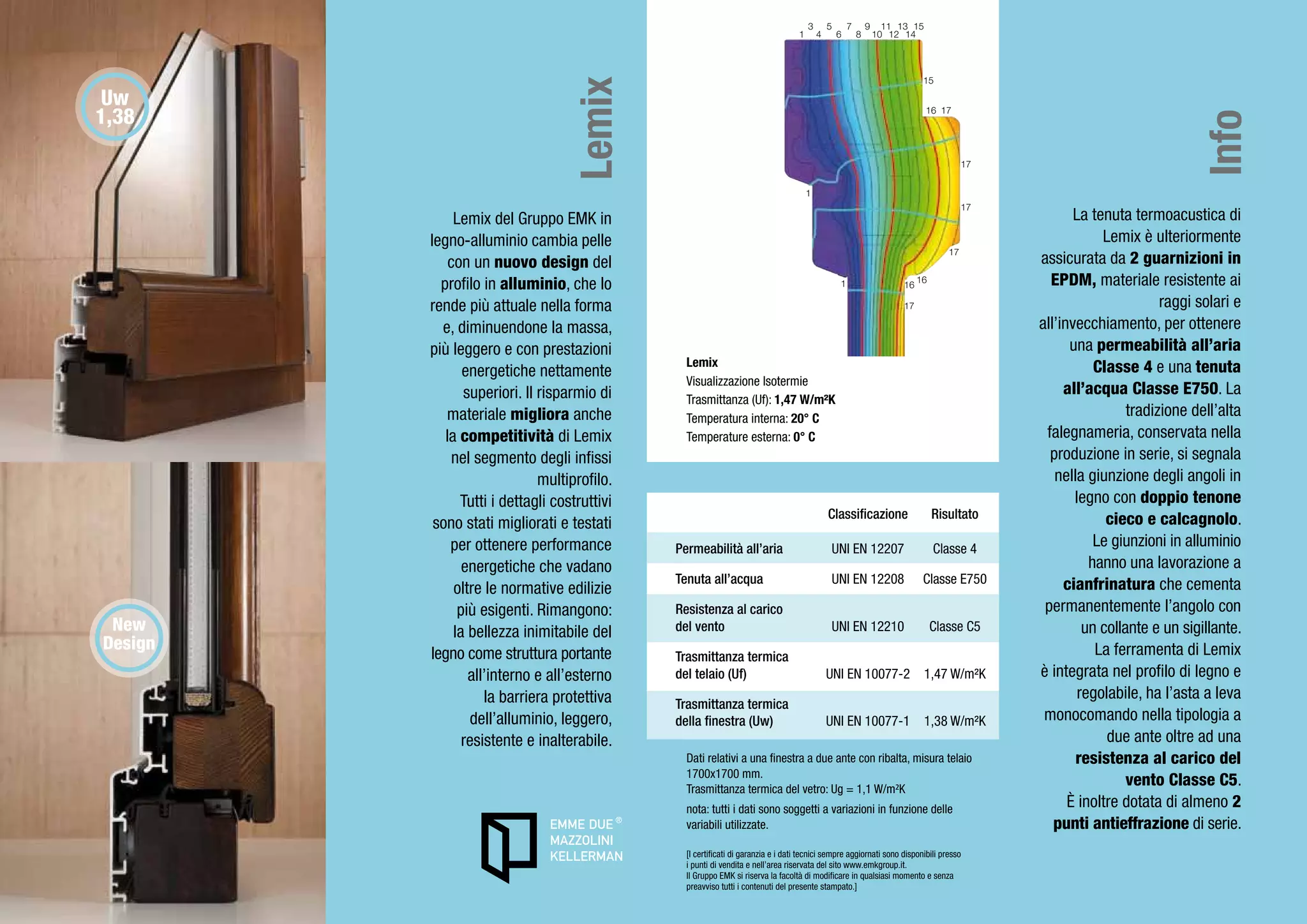 Il documento presenta il sistema di finestre Lemix del gruppo EMK, caratterizzato da un design innovativo e materiali avanzati per una maggiore prestazione termoacustica. Le finestre offrono bassi valori di trasmittanza termica, nonché una elevata resistenza agli agenti atmosferici e punti di sicurezza anti-effrazione. Grazie all'uso di legno lamellare e finiture atossiche, il prodotto combina estetica e funzionalità, rispettando le normative edilizie vigenti.