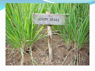 This document summarizes information about lemongrass oil, including its botanical name, production, cultivation parameters, uses, and trade. Lemongrass oil is extracted from Cymbopogon citratus grass through steam distillation. It grows in tropical climates with high sunlight and humidity. Common uses of lemongrass oil include use in insect repellents and as a preservative, pesticide, and culinary herb. Global production is around 1300 tonnes annually, with major producers including China, Indonesia, and India.