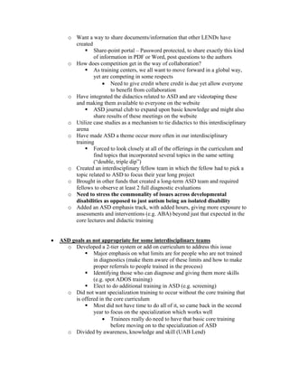The document summarizes discussions from a LEND breakout session focused on addressing challenges in implementing greater autism training at LEND centers. Key challenges discussed included lack of time in curriculums to add more autism content and difficulty tracking autism-related data and outcomes. Suggestions from various LEND programs centered on developing online training modules, tiered training approaches, and leveraging autism fellows to help disseminate expertise. Tracking autism referrals and outcomes remains an ongoing challenge due to limitations in billing practices and data collection across clinics.