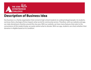 Lending Lions is a charity organization that connects high school students to underprivileged people in their community. Through their website and app, students can easily donate food and other items to local charities. The app allows students to check if a donation is still eligible based on its condition. Each month, Lending Lions collects donations of perishable and non-perishable goods from school drives and ensures the perishables are donated before their expiration dates. This addresses issues of food waste among youth in Utah and a lack of access to fresh foods for those in need.