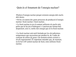 Quin és elfonament de l’energia nuclear? Parlem d’energia nuclear perquè extraiem energia dels nuclis dels àtoms. Hi ha a la natura dos grans processos de producció d’energia nuclear: fissió nuclear i fusió nuclear.. La fusió nuclear és tot el contrari utilitzem els nuclis més petits que hi ha (els d’hidrogen) i s’uneixen per formar heli desprenent, això sí, molta més energia que en la fissió nuclear. La fusió nuclear està molt limitada per les elevadíssimes temperatures que necessitem per produir-la, de l’ordre de centenar de milers de graus i de moment només existeix a nivell experimental. Ës important entendre que, de moment, no hi ha CAP central nuclear de fusió, totes utilitzen fissió nuclear.