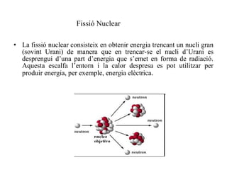 La fissió nuclearconsisteix en obtenir energia trencant un nucli gran (sovint Urani) de manera que en trencar-se el nucli d’Urani es desprengui d’una part d’energia que s’emet en forma de radiació . Aquesta escalfa l’entorn i la calor despresa es pot utilitzar per produir energia, per exemple, energia elèctrica . Fissió Nuclear