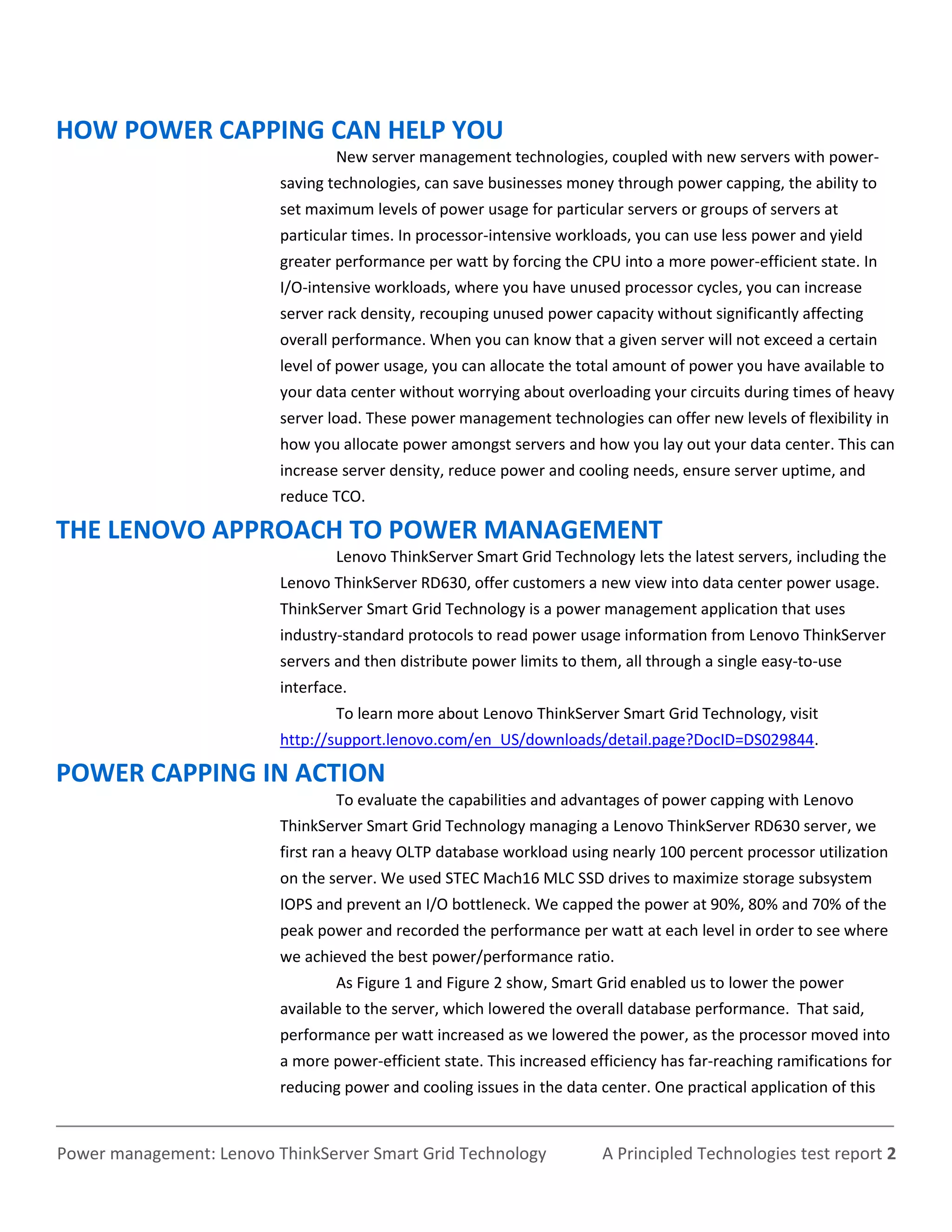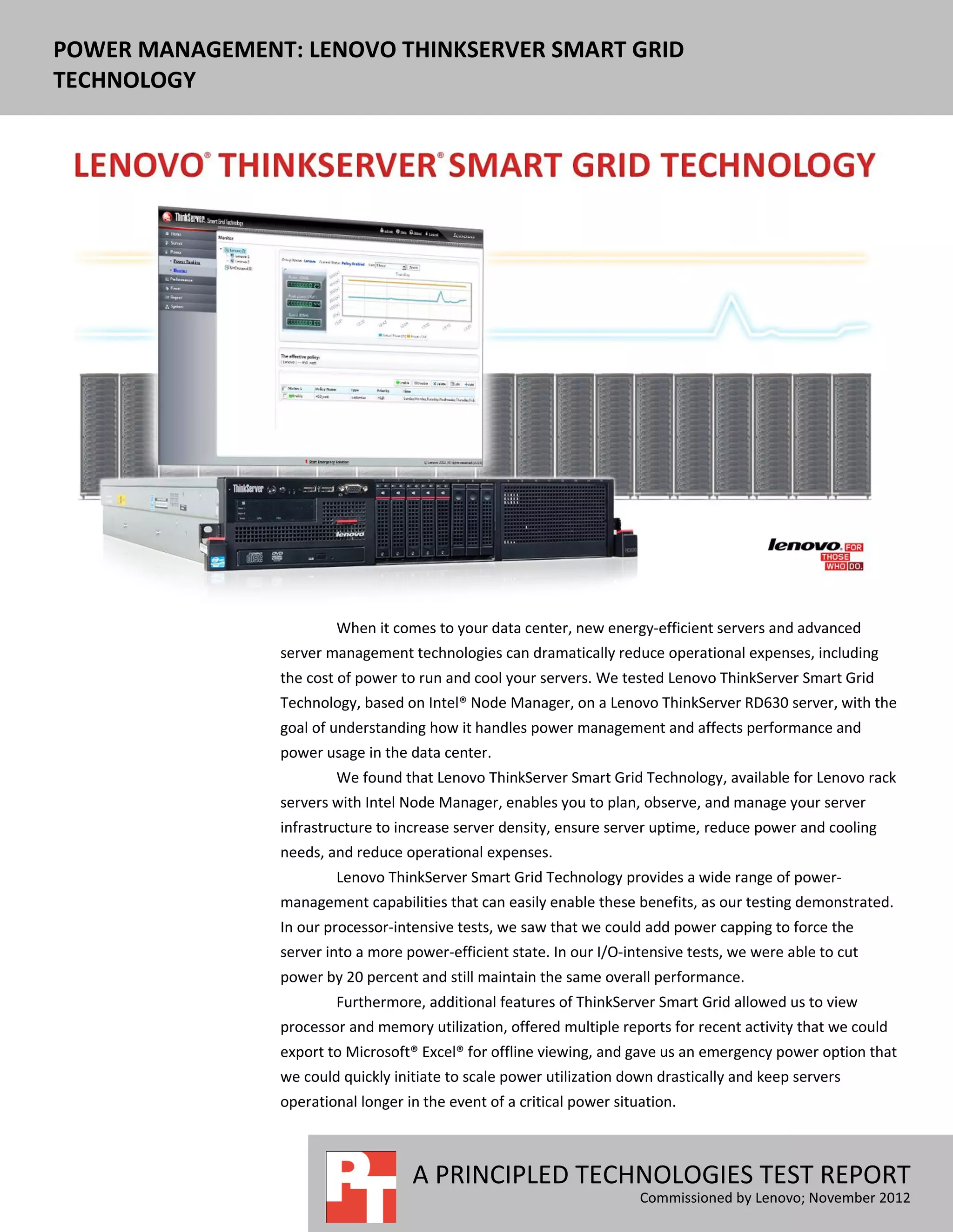 The Lenovo ThinkServer Smart Grid Technology enhances data center efficiency through advanced power management, enabling businesses to monitor, plan, and manage server power usage effectively. Testing demonstrated that power capping can lead to significant reductions in energy costs while maintaining performance, especially under heavy workloads. Key features include customizable power policies, emergency solutions for critical workloads, and real-time monitoring capabilities, all contributing to increased server density and lower operational expenses.