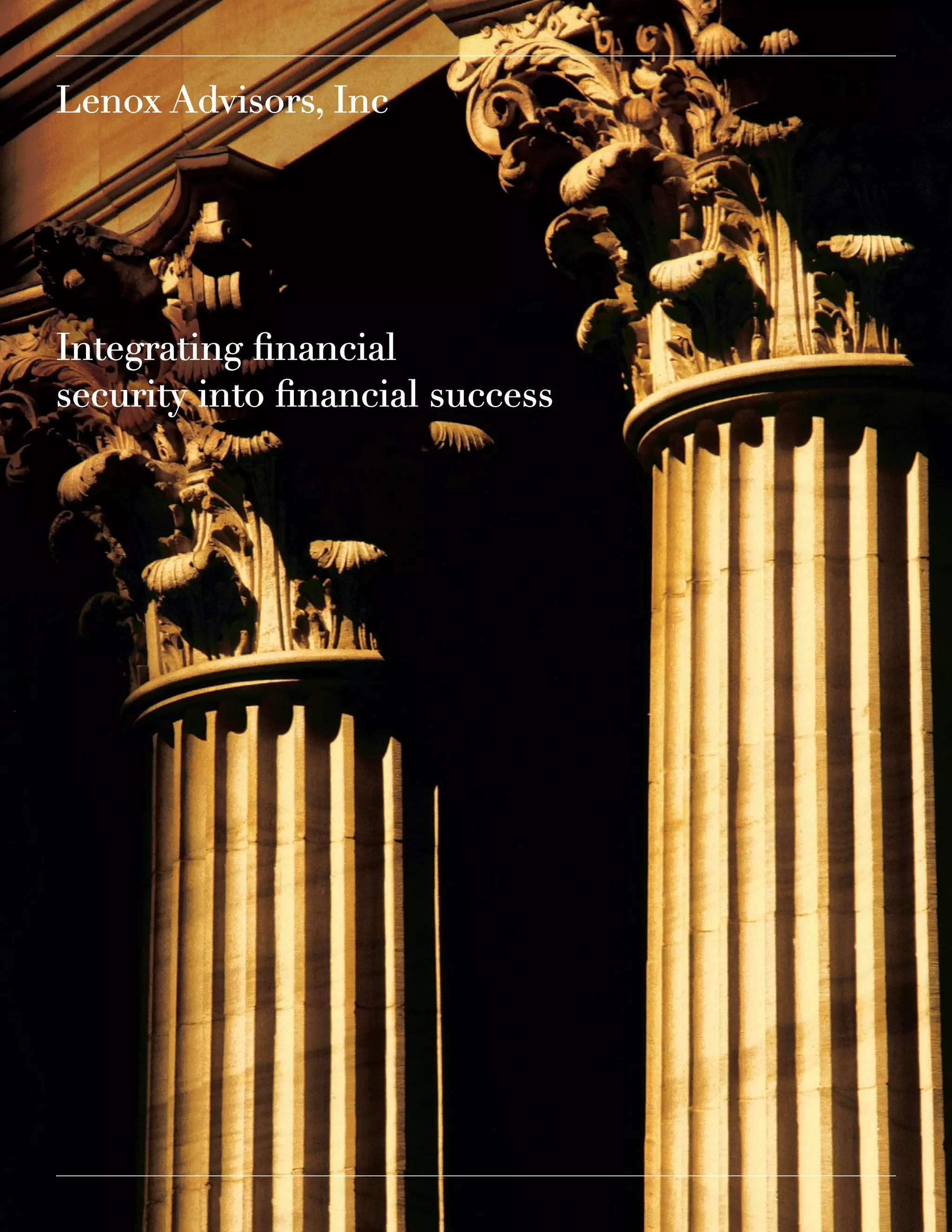 Lenox Advisors is a wealth advisory firm that focuses on high-net-worth individuals and corporate clients. They coordinate all aspects of clients' financial lives, including retirement planning, asset management, risk management, estate planning, and more. Lenox Advisors reduces the complexity in clients' financial lives through a comprehensive and holistic program. They become clients' "personal CFO" by developing financial goals and strategies. Lenox Advisors takes a values-based approach and helps clients communicate their financial values to their families.