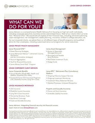 Lenox Advisors is a wealth advisory firm that caters to high net worth individuals and corporate clients, providing comprehensive financial management services. Their offerings include retirement planning, asset management, estate planning, and various employee benefit programs. The firm emphasizes integrated financial security and success through personalized advisory services.