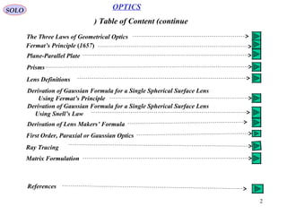 The document provides a comprehensive overview of geometrical optics, including foundational principles such as Fermat's principle, the laws of reflection and refraction, and various types of optical devices like lenses and prisms. It elaborates on the mathematical relationships governing ray behavior as light interacts with different media and covers applications of these principles in devices such as dispersing and reflecting prisms. Key definitions related to optical systems, including focal points and stops, are also explained to illustrate how they influence image formation.
