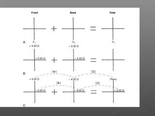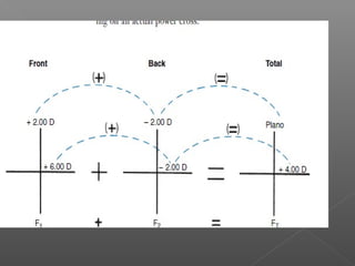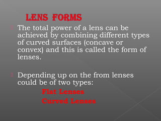 The document discusses different types of lenses based on their curvature and shape. There are two main types: flat lenses, which have one flat surface, and curved lenses, which have curves on both surfaces. Curved lenses include meniscus lenses, which are convex on the front and concave on the back, and toric lenses, where one surface is spherical and the other toroidal. The total power of a lens is calculated by adding the powers of the front and back surfaces. Lens shape refers to the outline and can include round, oval, pantascopic round oval, and upswept shapes.