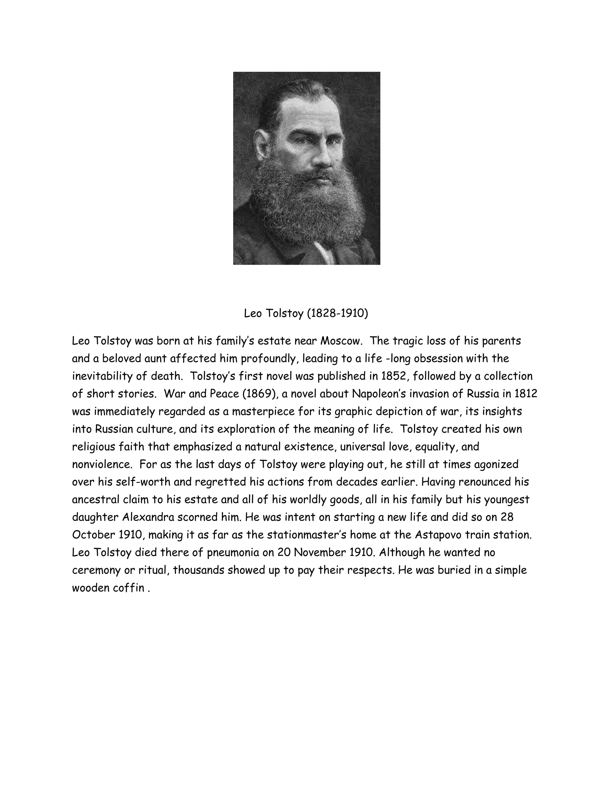 Leo Tolstoy was born in 1828 near Moscow and was deeply affected by the loss of his parents and aunt at a young age, leading him to obsess over death. He published his first novel in 1852 and his masterpiece War and Peace in 1869. Tolstoy created his own religious faith emphasizing natural living, love, equality and nonviolence. In his later years, Tolstoy renounced his wealth and estate, causing a rift with his family except his youngest daughter. He died of pneumonia in 1910 at a train station while trying to start a new life, though thousands came to pay their respects to the renowned author.