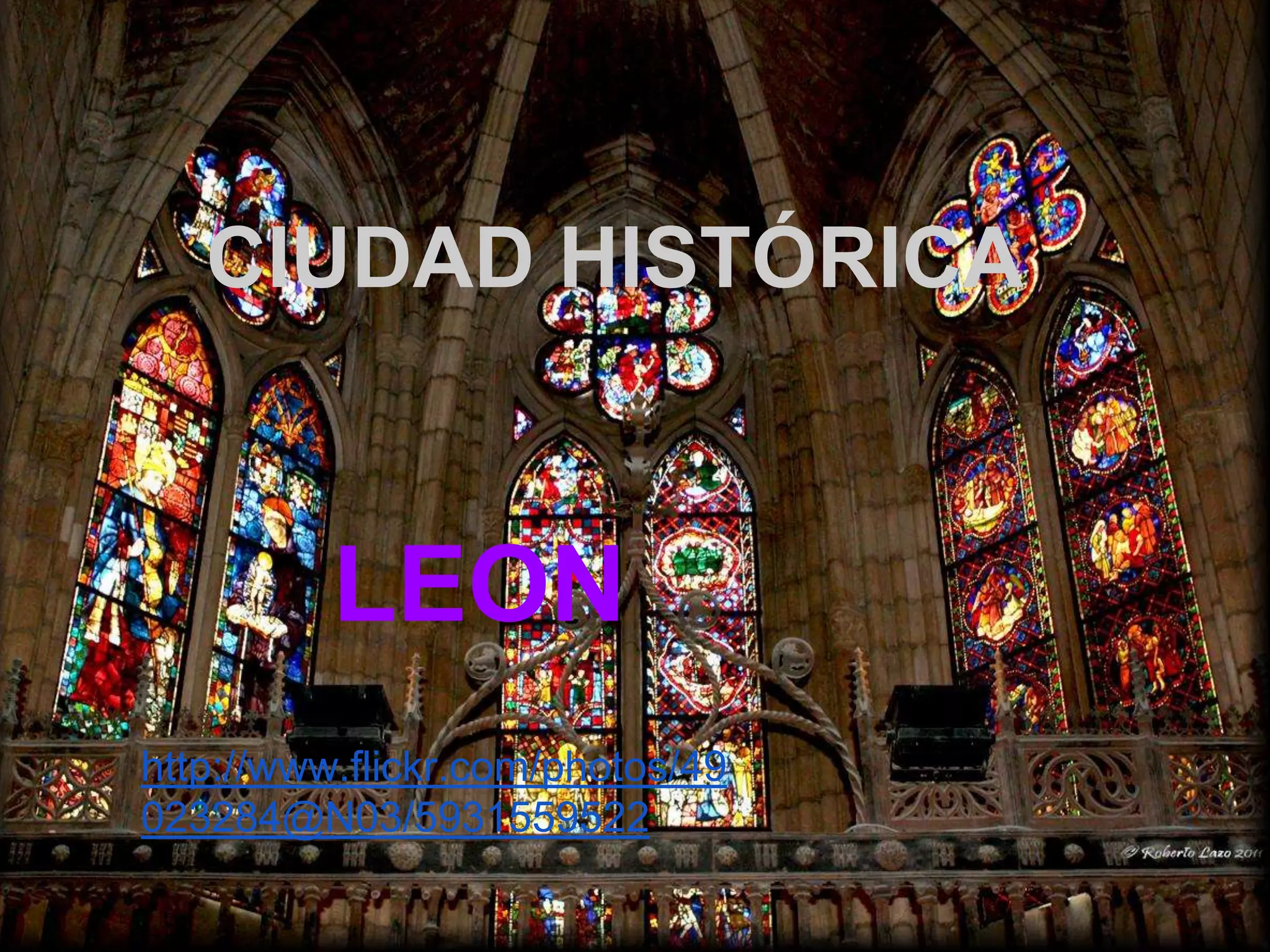 The document describes some of the historic sites in the city of Leon, Spain. It includes photos and references to the old town of Leon, walking around the streets of Leon, the church of San Isidoro, the city hall building, and the Leon Cathedral, highlighting the cathedral as a beautiful landmark.