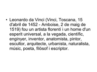 Leonardo da vinci 1. 2. Leonardo da Vinci (Vinci, Toscana, 15 d'abril de 1452 - Amboise, 2 de maig de 1519) fou un artista florentí i un home d'un esperit universal, a la vegada, científic, enginyer, inventor, anatomista, pintor, escultor, arquitecte, urbanista, naturalista, músic, poeta, filòsof i escriptor. 3. 4. 5. 6. 7. 8. 9. A dalt, una mena d'helicòpter. A sota, estudi sobre la força d'aixecament d'una ala. 10.