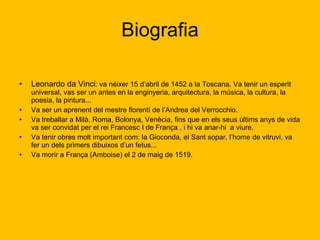 Biografia Leonardo daVinci : va néixer 15 d’abril de 1452 a la Toscana. Va tenir un esperit universal, vas ser un antes en la enginyeria, arquitectura, la música, la cultura, la poesia, la pintura... Va ser un aprenent del mestre florentí de l’Andrea del Verrocchio. Va treballar a Milà, Roma, Bolonya, Venècia, fins que en els seus últims anys de vida va ser convidat per el rei Francesc I de França , i hi va anar-hi a viure. Va tenir obres molt important com: la Gioconda, el Sant sopar, l’home de vitruvi, va fer un dels primers dibuixos d’un fetus... Va morir a França (Amboise) el 2 de maig de 1519.