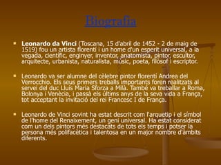 Biografia Leonardo daVinci (Toscana, 15 d'abril de 1452 - 2 de maig de 1519) fou un artista florentí i un home d'un esperit universal, a la vegada, científic, enginyer, inventor, anatomista, pintor, escultor, arquitecte, urbanista, naturalista, músic, poeta, filòsof i escriptor. Leonardo va ser alumne del cèlebre pintor florentí Andrea del Verrocchio. Els seus primers treballs importants foren realitzats al servei del duc Lluís Maria Sforza a Milà. També va treballar a Roma, Bolonya i Venècia, i passà els últims anys de la seva vida a França, tot acceptant la invitació del rei Francesc I de França. Leonardo de Vinci sovint ha estat descrit com l'arquetip i el símbol de l'home del Renaixement, un geni universal. Ha estat considerat com un dels pintors més destacats de tots els temps i potser la persona més polifacètica i talentosa en un major nombre d'àmbits diferents.