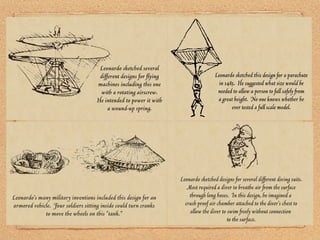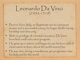Leonardo Da Vinci was an Italian polymath, scientist, mathematician, engineer, inventor, anatomist, painter, sculptor, architect, botanist, musician and writer born during the Renaissance. He had no formal education but was a self-taught genius who made significant contributions across multiple fields through keen powers of observation and experimentation. Some of his most famous works include the Mona Lisa painting and extensive notebooks containing thousands of drawings and notes on science, invention, art and more. He approached his work with a scientific mindset far ahead of his time.