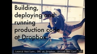 This document discusses Dropbox's approach to building, deploying, and running production code, highlighting their migration to a unified build system using Bazel. It outlines the evolution of their deployment and service management processes, transitioning from older tools like Puppet and Supervisord to more efficient solutions like dbxinit. Key insights from their experience emphasize the importance of robust remote build caching, explicit dependency management, and the challenges faced in containerization and service monitoring.